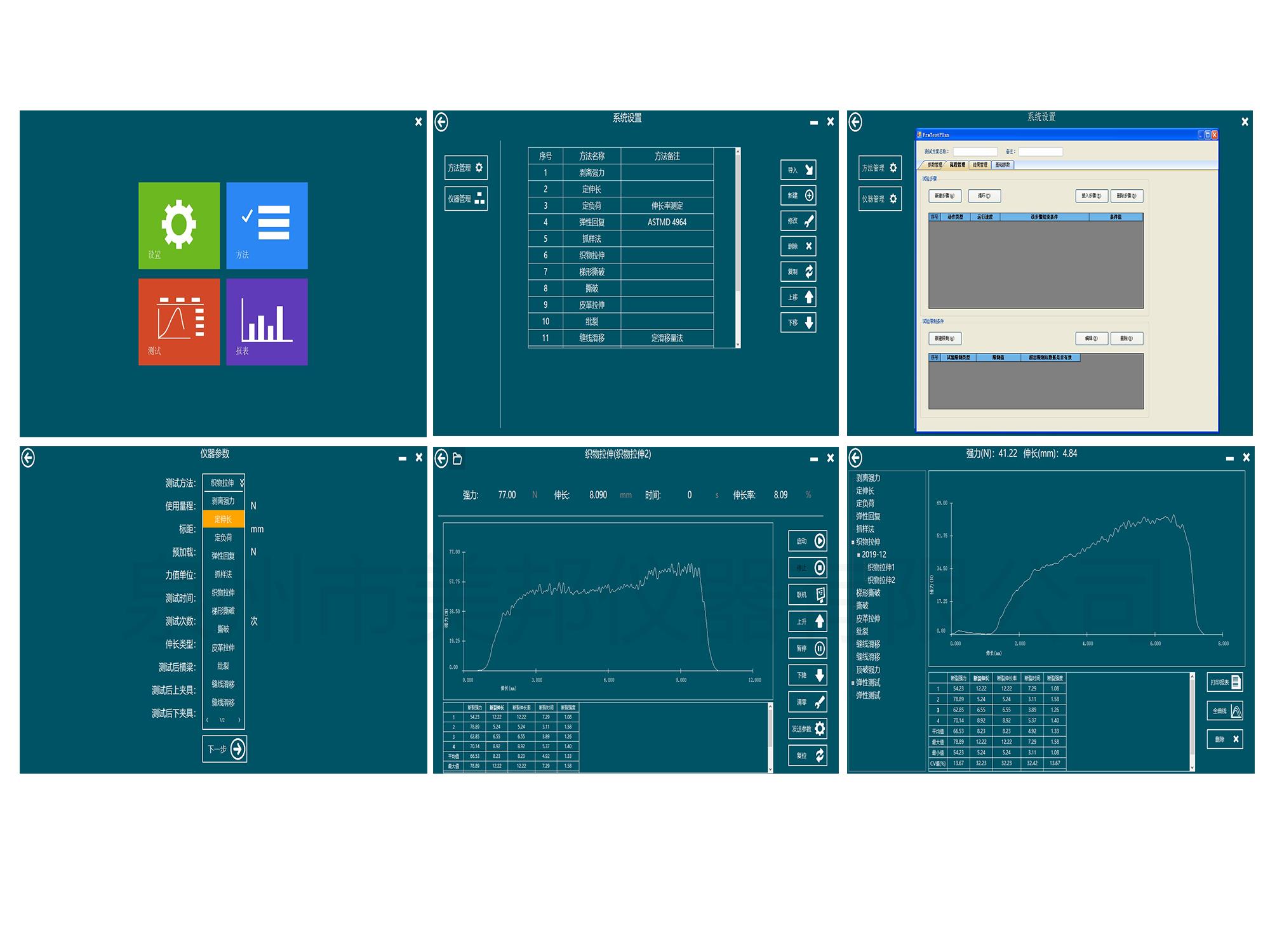 用于各種紡織品、非織造布、土工布、拉鏈、橡膠、鞋材、皮革、金屬、建材等材料的拉伸、撕破、頂破、剝離、定伸長、定負荷、彈性回復、縫線滑移、模量、單紗強力等力學性能分析測試。