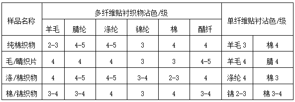 多纖維貼襯系由多種纖維組合而成,因其結(jié)構(gòu)、紗支和密度與單纖維貼襯不同,所以沾色效果不同。以常用的SDC多纖DW為例按GB/T3921A(1)方法不同,比對(duì)結(jié)果見(jiàn)表2。