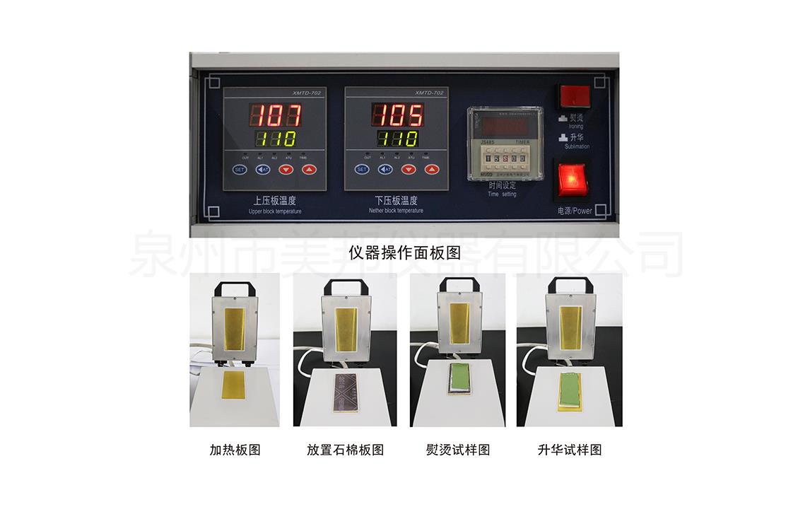 本儀器采用微機(jī)控制,在規(guī)定的溫度和壓力下對(duì)試樣加熱熨燙,試樣受熱時(shí)間、溫度可以予置,到時(shí)蜂鳴器報(bào)警。